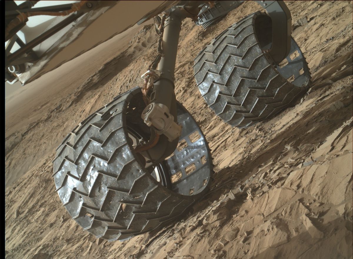 Damage watch – inspection of rover’s wheels. Curiosity acquired this image using its Mars Hand Lens Imager (MAHLI), located on the turret at the end of the rover’s robotic arm, on November 8, 2015, Sol 1157.