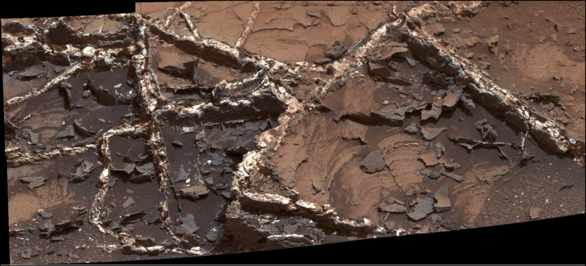 This view from the Mast Camera (Mastcam) on NASA’s Curiosity Mars rover shows a site with a network of prominent mineral veins below a cap rock ridge on lower Mount Sharp.