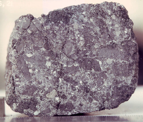 Sawn surface of fragmental lunar breccia 14306 illustrating the nature of lunar brcccias. This is a sample of the Fra Mauro Formation and is typical of ejecta from large basins. Credit: NASA photo no. 72-22103