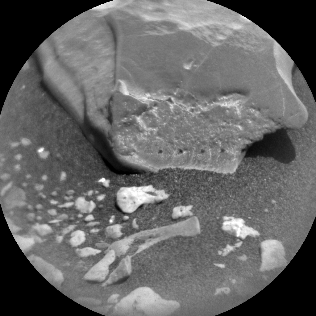 The rover’s Mars Hand Lens Imager (MAHLI) is slated to take some images of Marchmont, and then the arm will be moved out of the way for Chemistry and Camera (ChemCam) observations of Marchmont and “Inverness Shire,” a darker block sitting on the bedrock surface.