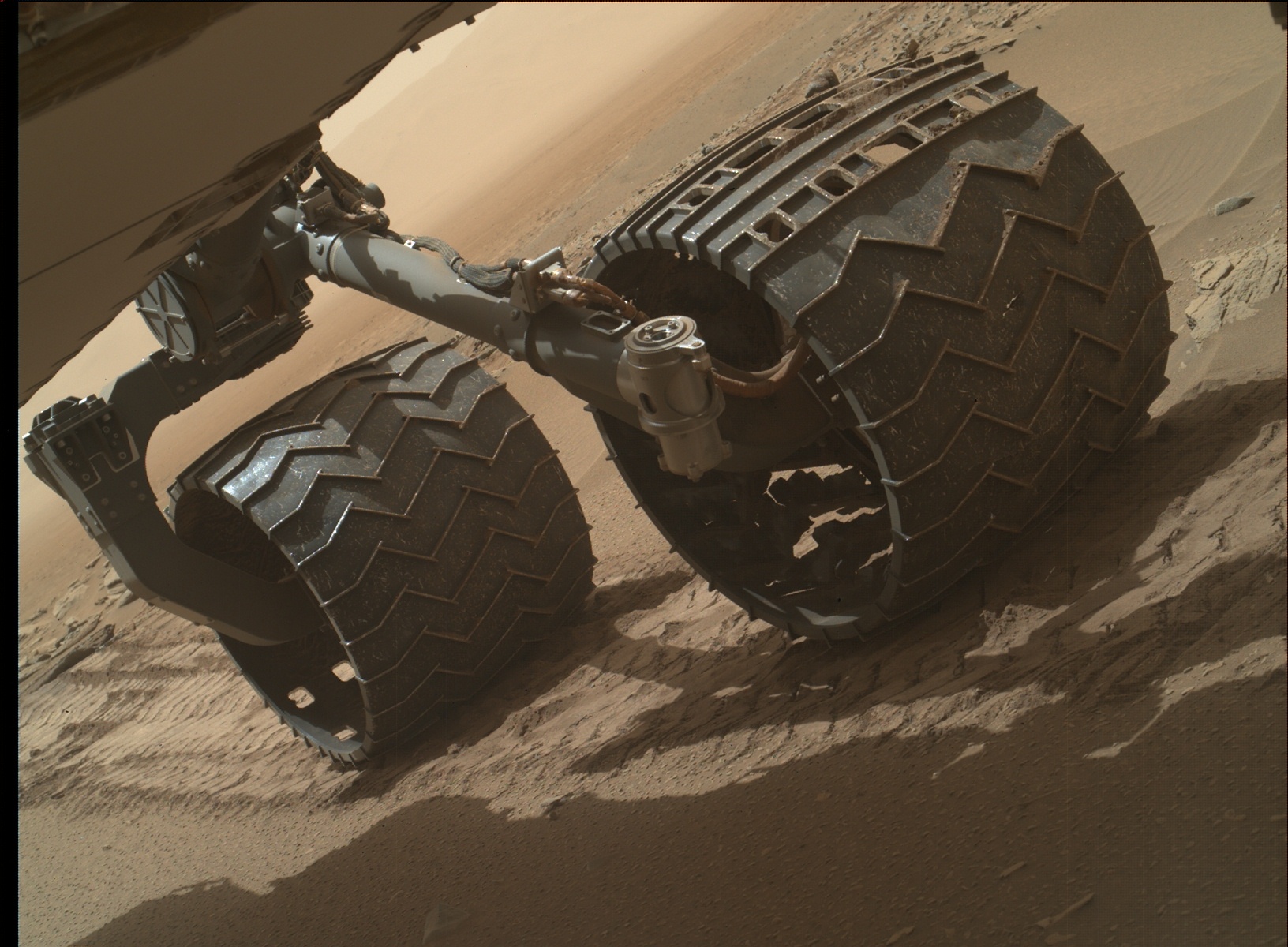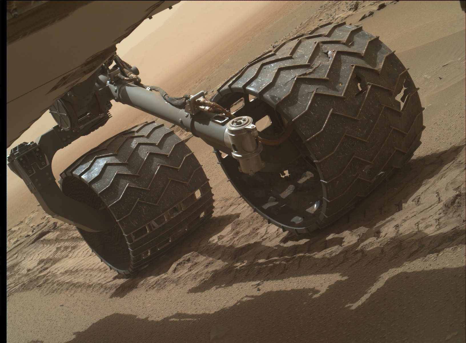Mars Hand Lens Imager (MAHLI) inspection of wheel wear on Curiosity rover, taken on July 16, 2015, Sol 1046.