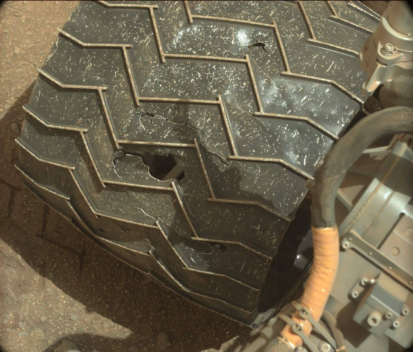 NASA’s Curiosity Mars rover faces on-going wheel wear and tear as it continues its trek across the sandy and rock strewn Red Planet.
