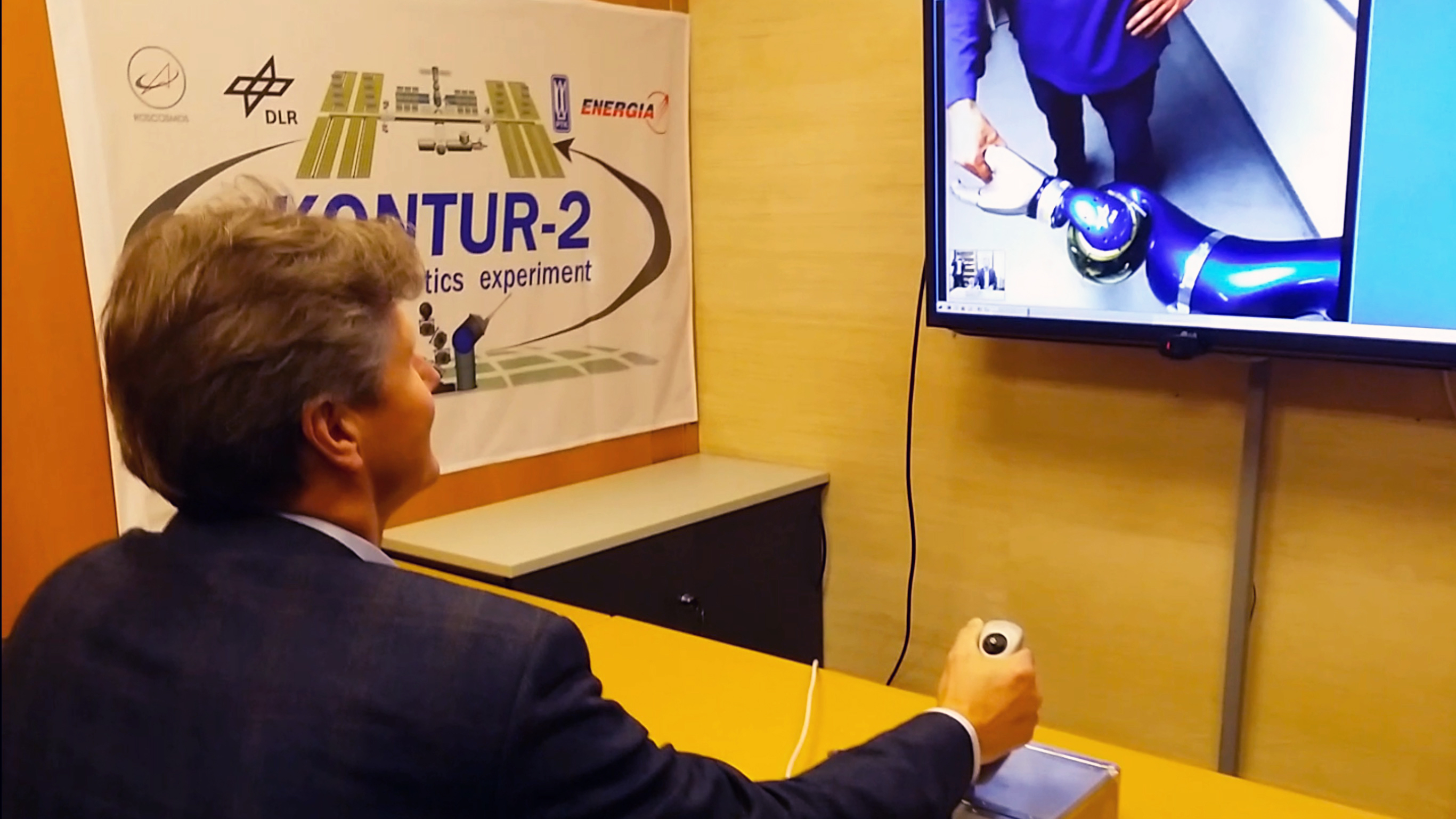 The upcoming experiment will have a cosmonaut on board the ISS use the Kontur 2 joystick to operate a DLR robot – “Space Justin” — who will remotely shake a person’s hand, making use of force feedback.