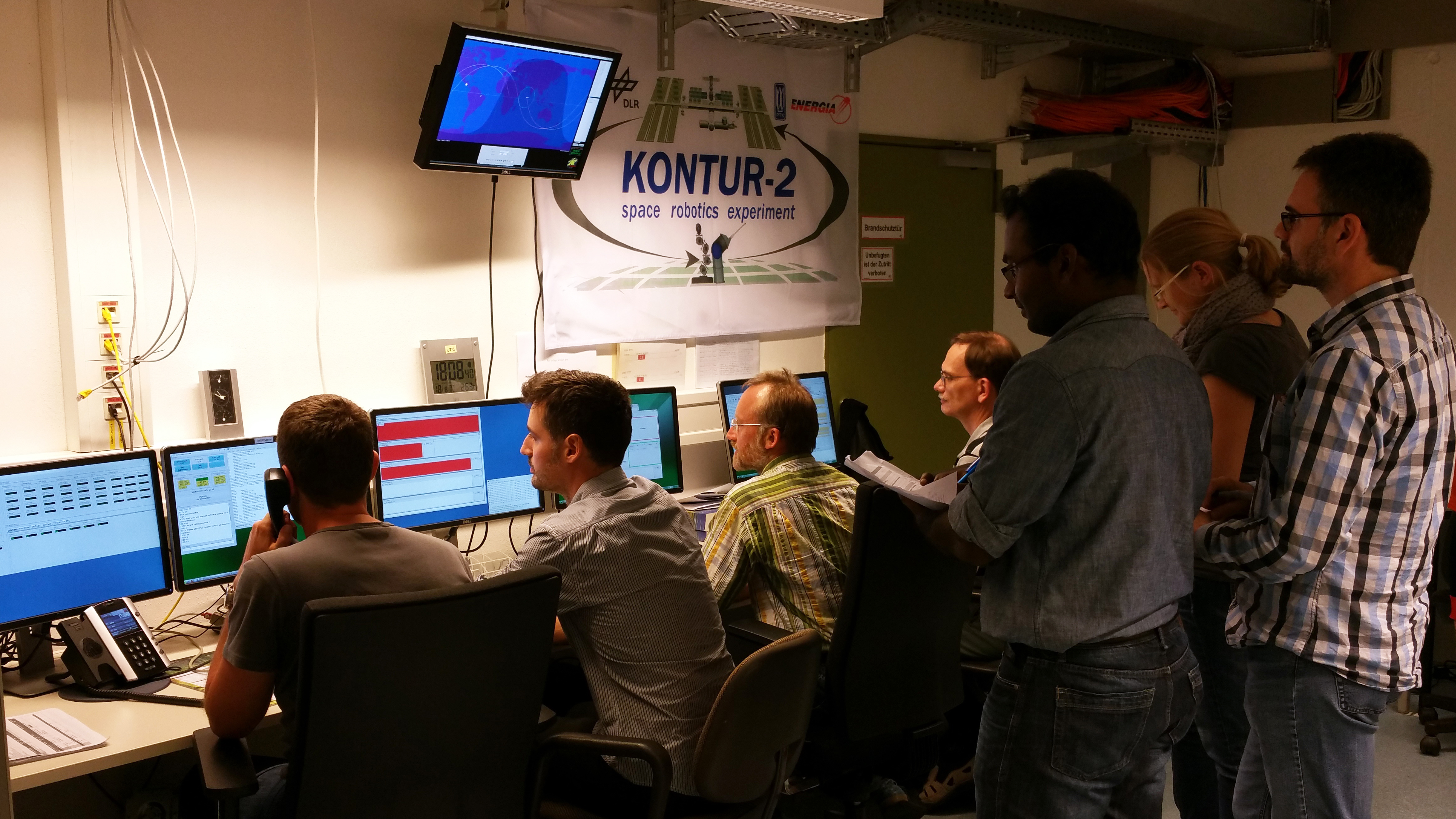While cosmonaut Oleg Kononenko in the International Space Station uses the Kontur-2 joystick to control the ROKVISS robot on the ground, researchers at the German Aerospace Center (Deutsches Zentrum für Luft- und Raumfahrt; DLR) monitor and supervise the contact and give instructions.