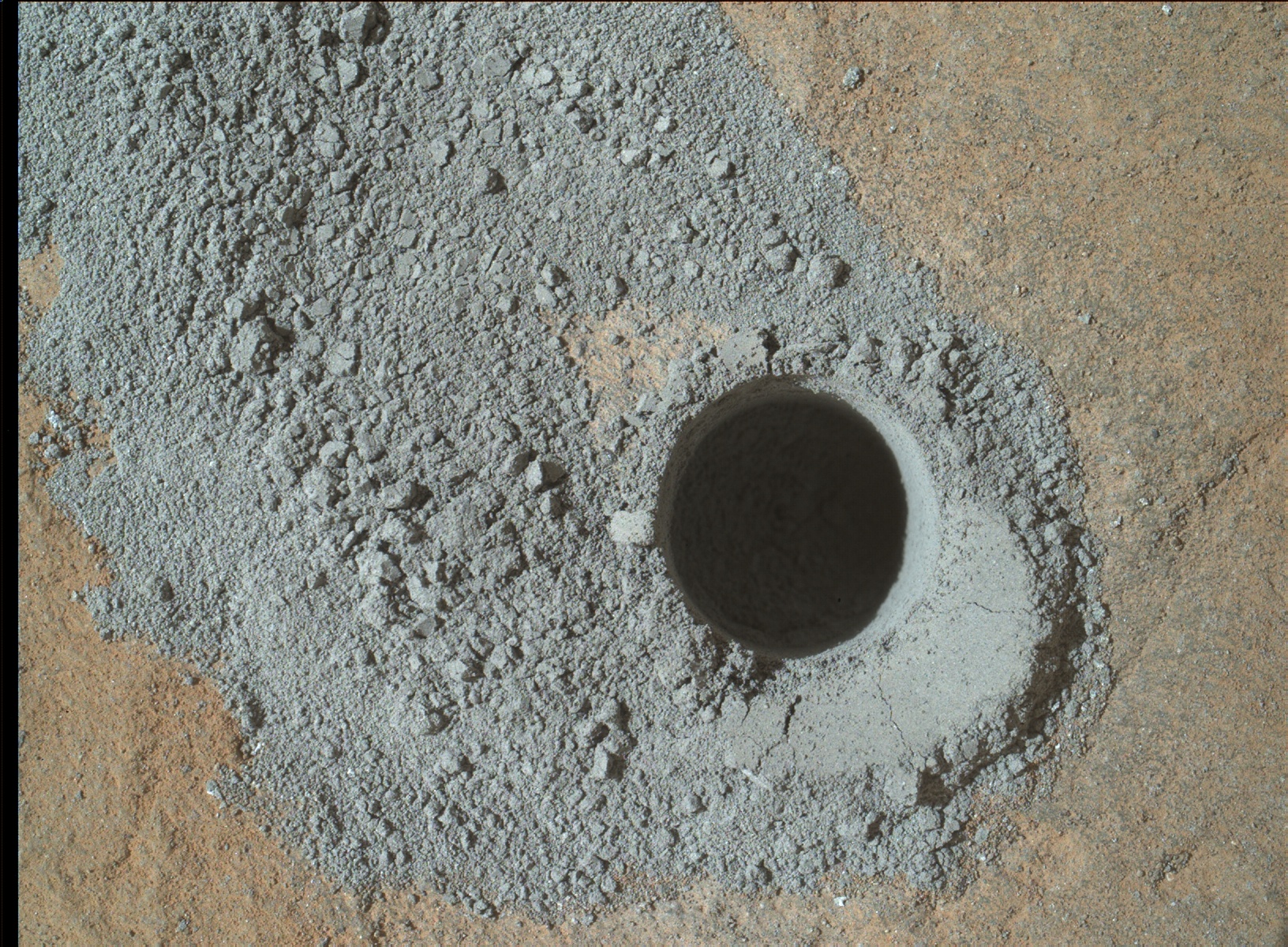 Big Sky drilling result. NASA’s Mars rover Curiosity acquired this image using its Mars Hand Lens Imager (MAHLI), located on the turret at the end of the rover’s robotic arm, on September 29, 2015, Sol 1119 of the Mars Science Laboratory Mission.