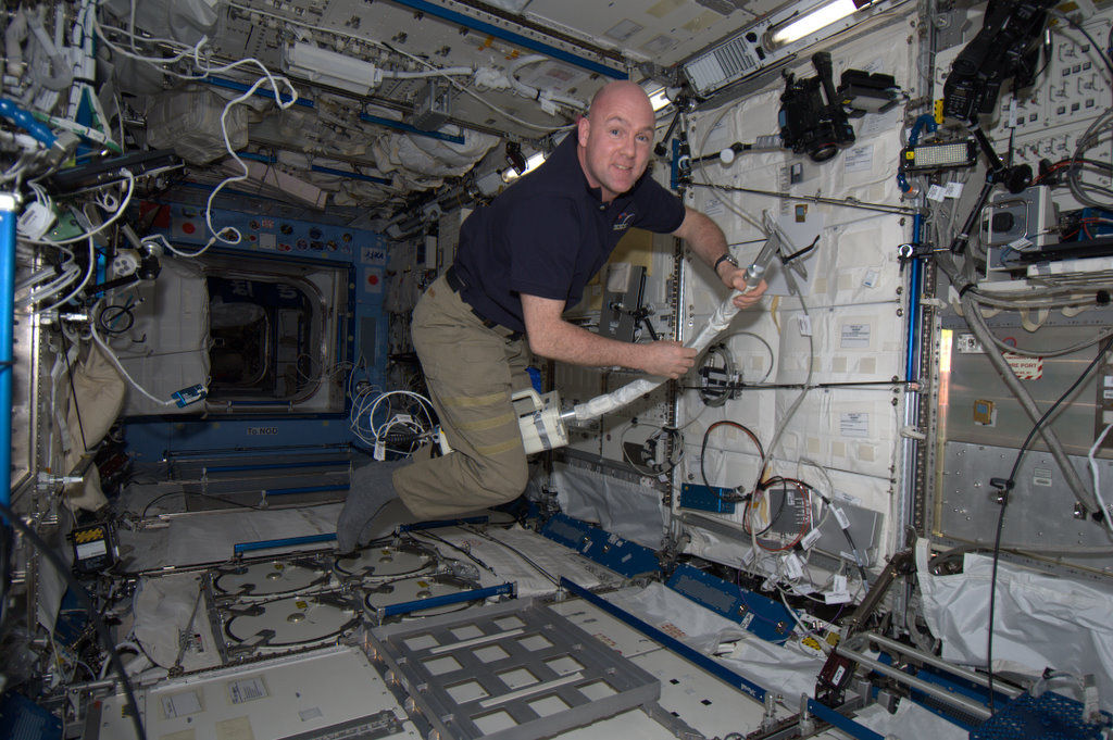 NASA astronaut Scott Kelly, a flight engineer for Expedition 43 and a member of the one-year crew, is seen here inside the ISS Unity module.