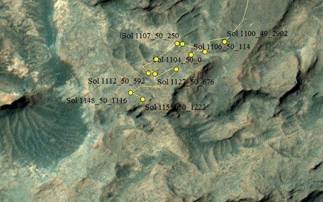 This map shows the route driven by NASA’s Mars rover Curiosity through the 1151 Martian day, or sol, of the rover’s mission on Mars (November, 02, 2015).