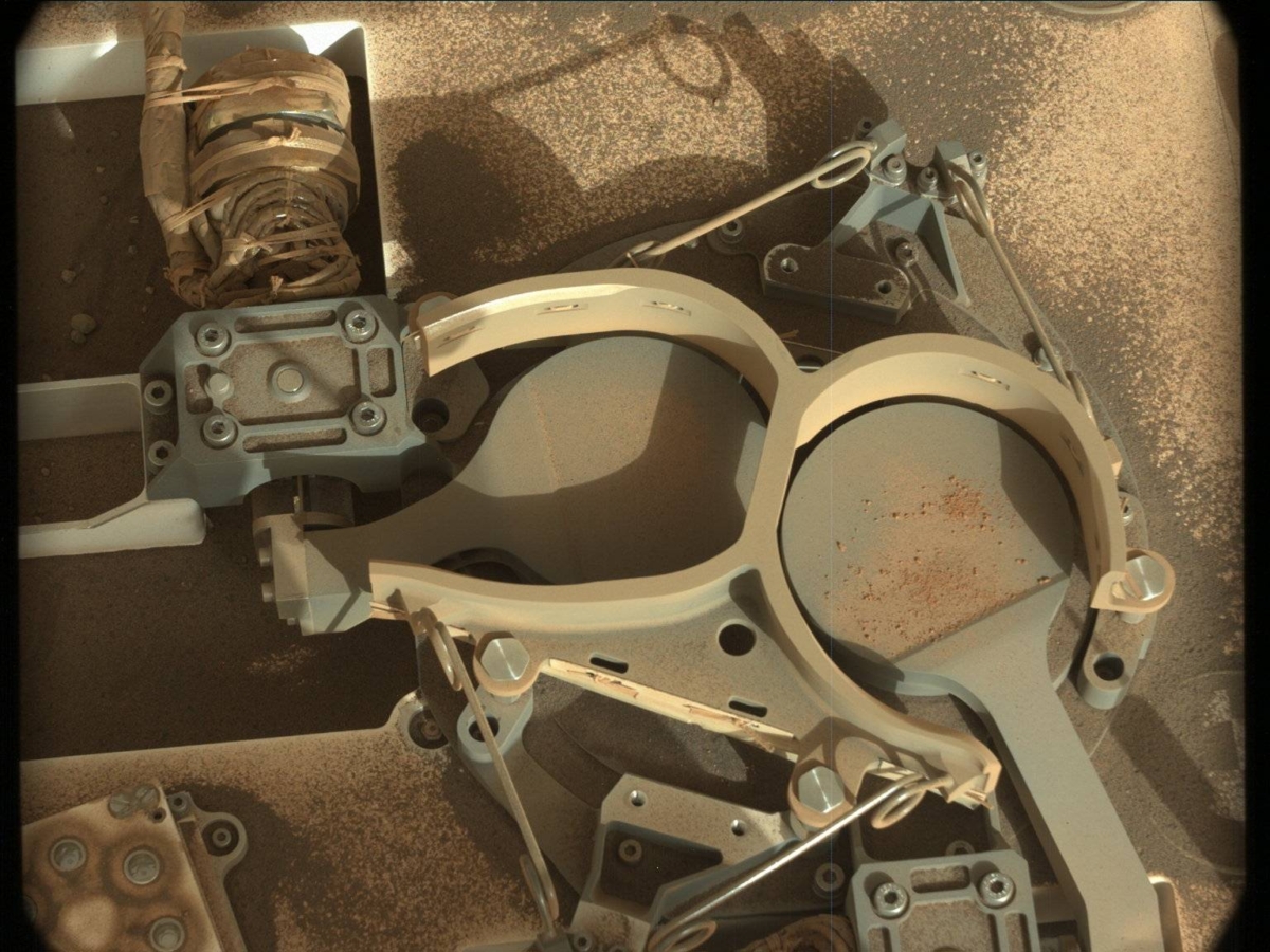 Curiosity drill bit positioned over the Chemistry & Mineralogy X-Ray Diffraction/X-Ray Fluorescence Instrument (CheMin) inlet as part of the new Feed Extended Sample Transfer (FEST) drop-off technique.