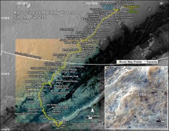 The map shows the route driven by NASA’s Mars rover Curiosity through the 2104 Martian day, or sol, of the rover’s mission on Mars (July 09, 2018).