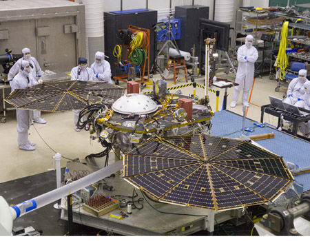 Clean room care: InSight Mars lander undergoes a solar array deployment test at Lockheed Martin.