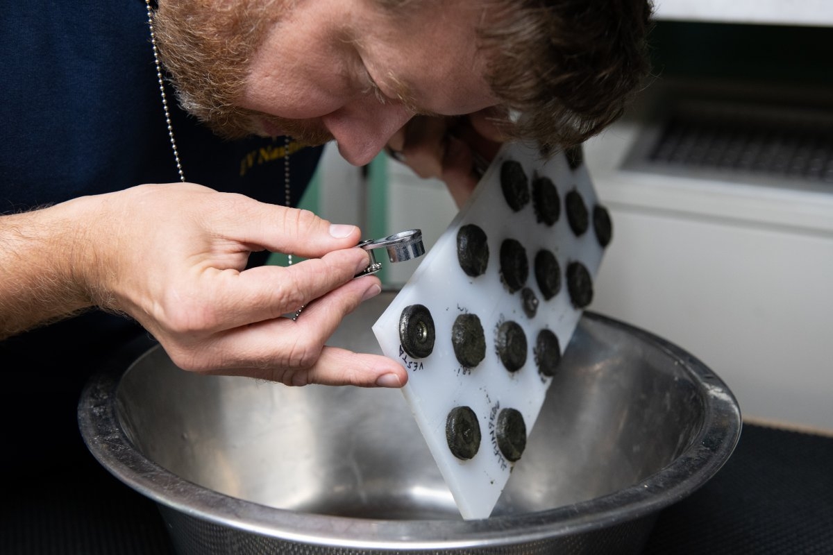 While exploring this area, the Nautilus team collected several sediment samples using a suction hose sampler, magnetic plate, and sediment scoop. Upon recovering the vehicles, the team spent about six hours in the ship’s wet lab sifting and processing through these silty samples.
