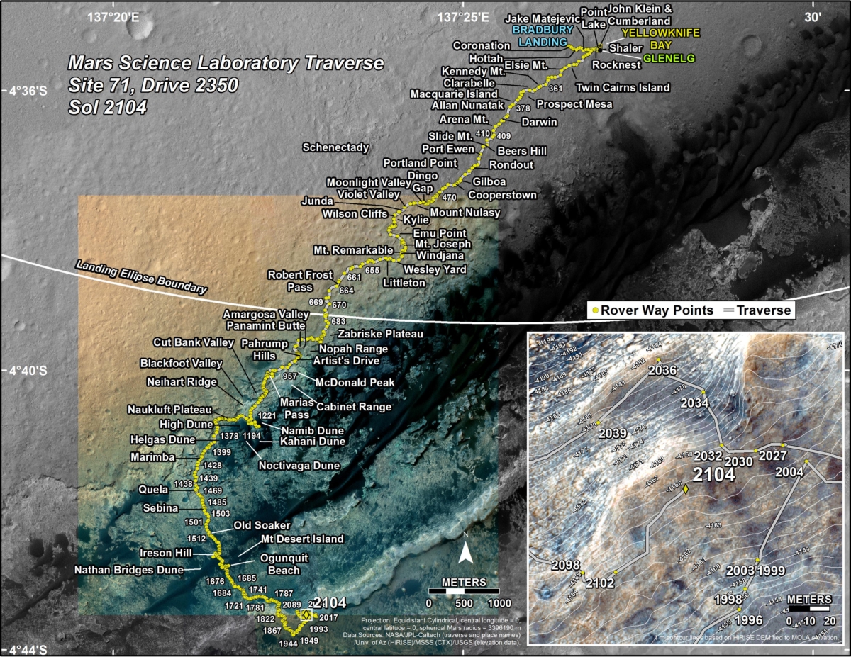 The map shows the route driven by NASA’s Mars rover Curiosity through the 2104 Martian day, or sol, of the rover’s mission on Mars (July 09, 2018).