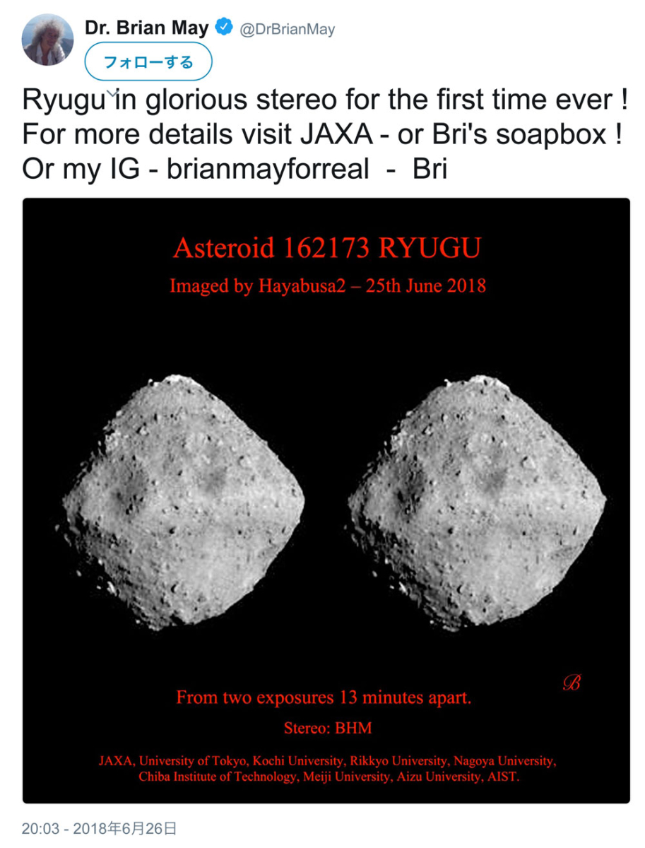 Brian May, the lead guitarist from the British rock band, Queen, has created a stereoscopic image of Ryugu from photographs captured with the Optical Navigation Camera onboard Hayabusa2, so that the asteroid can be viewed in three dimensions.