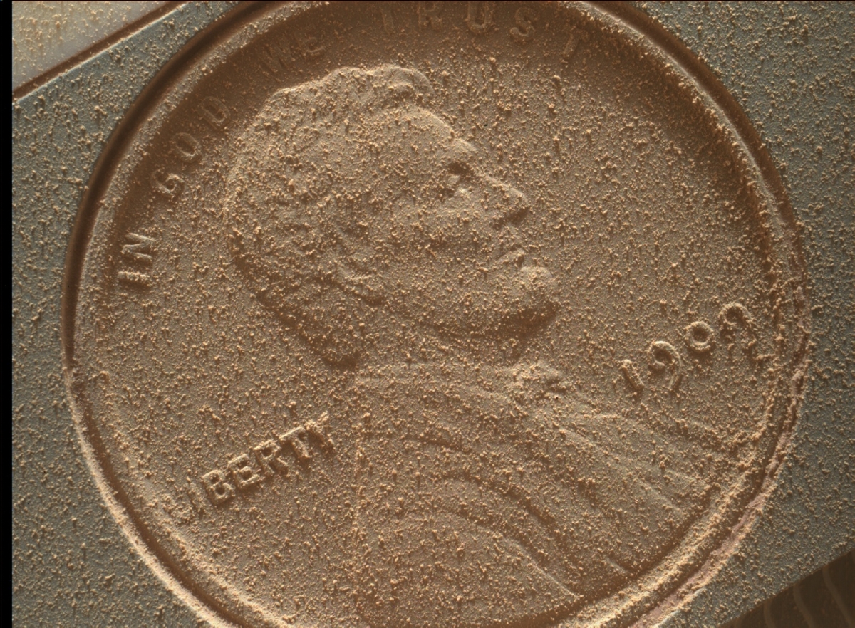 Part of the calibration target for Curiosity Mars Hand Lens Imager (MAHLI), a photo produced on Sol 2161, September 4, 2018. MAHLI is located on the turret at the end of the rover’s robotic arm. The MAHLI calibration target includes color chips, a metric standardized bar graphic, a penny, and a stair-step pattern for depth calibration.