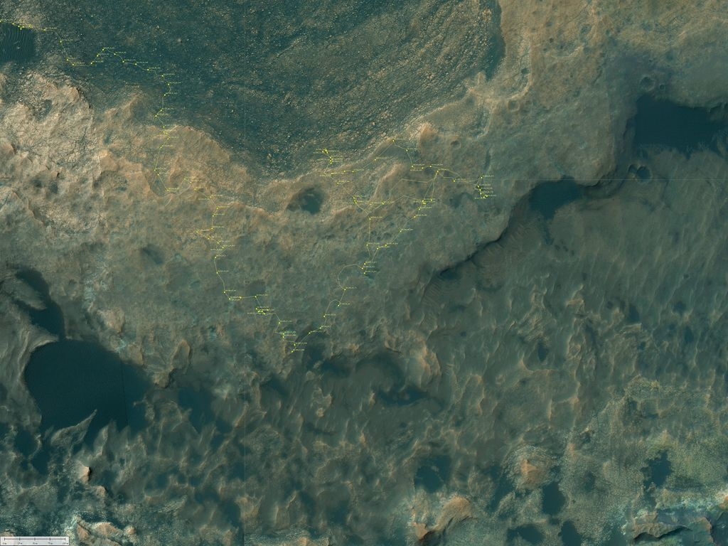 Numbering of the dots along the line indicate the sol number of each drive. North is up. The scale bar is 1 kilometer (~0.62 mile).