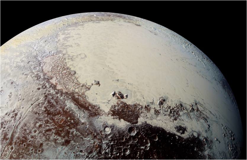 Pluto in enhanced color showing the vast Sputnik Planitia (SP) N2-dominated