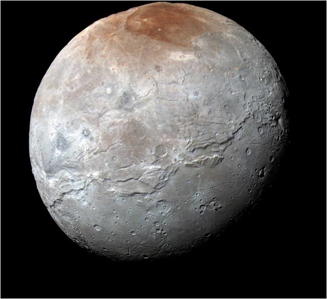 Charon as seen by New Horizons, featuring its red polar stain, ancient
