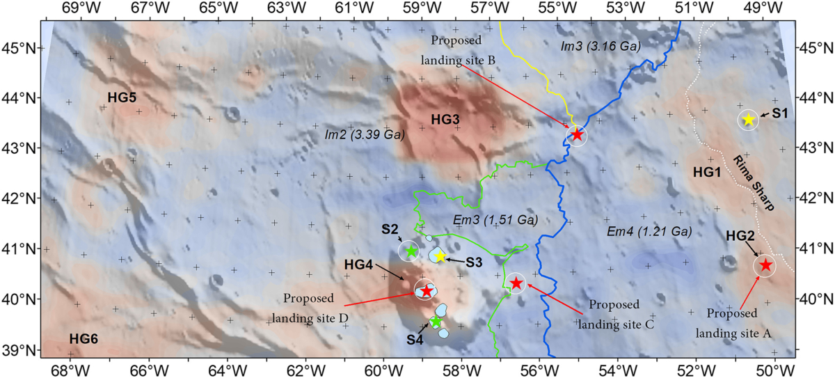 Locations of proposed Chang’e-5 landing sites (marked by red stars) from new study.