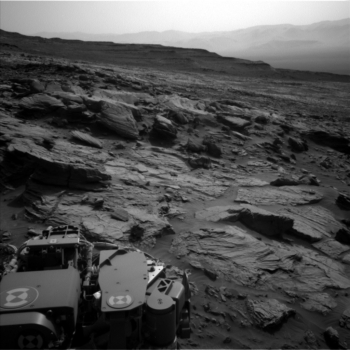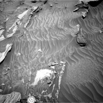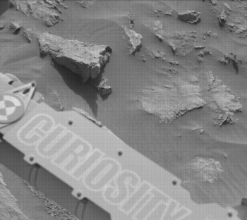 Thompson says, because of the tricky terrain, Curiosity’s recent drive stopped a little short of its intended location and the Mars machinery ended up perched on a rock, such that controllers were not able to safely deploy the arm and use either the Mars Hand Lens Imager (MAHLI) or the Alpha Particle X-Ray Spectrometer (APXS).