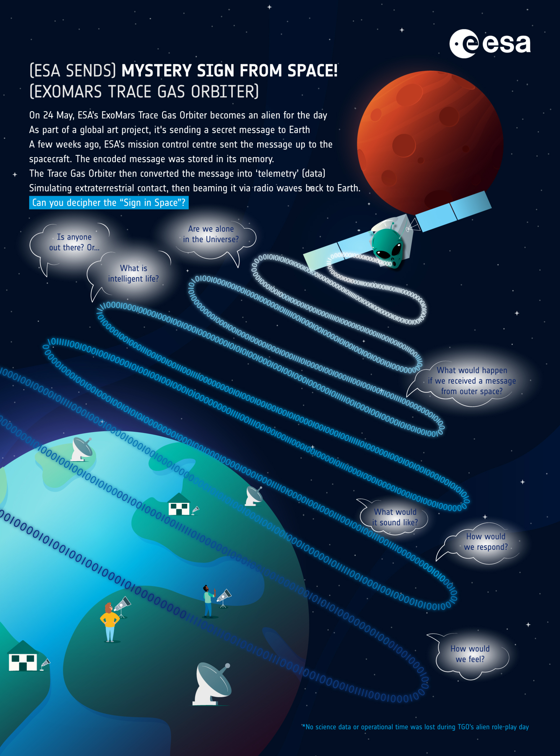 The actual ET-mimicking message was first sent up to TGO from ESA’s mission control centre in Darmstadt, Germany, on May 10. It was stored onto its memory, converted into ‘telemetry’ (data) and will this evening be beamed back down to Earth.