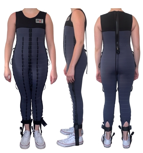 The Skinsuit produces a static load from the shoulders to the feet with elastic material in the form of a skin-tight wearable suit.