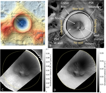 dashed line shows the map area for secondary illumination modeling. (B) Parts of the crater and PSR and a reference (yellow text) adopted in this work. (C) Mosaic of ShadowCam images showing the floor and wall (D) Secondary illumination model generated irradiance map, cropped to the PSR extent (yellow circular boundary). Colorbar in (C) and (D) shows ShadowCam radiance and model irradiance, respectively. PSR, permanently shadowed regions. Image credit: Prasun Mahanti, et al.