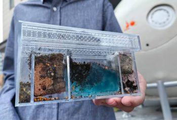 The Vernadsky Institute of Geochemistry and Analytical Chemistry teamed with the Institute of Medical and Biological Problems to produce a container holding 16 test tubes. The vials hold lunar simulants – dust and rocks — that mimic Moon topside materials found at high latitudes of the Moon.