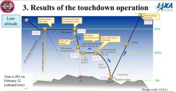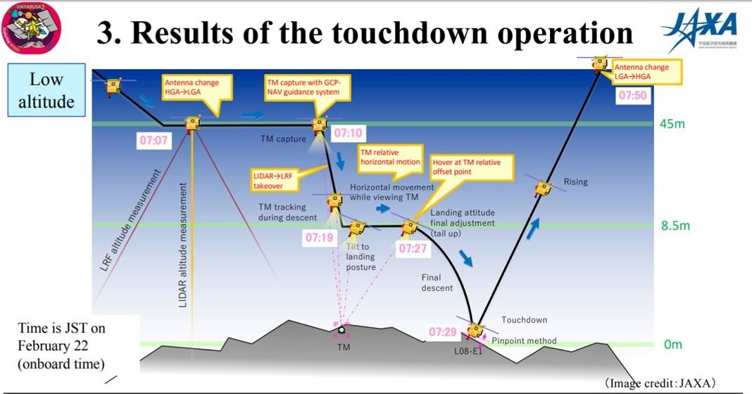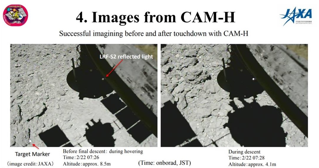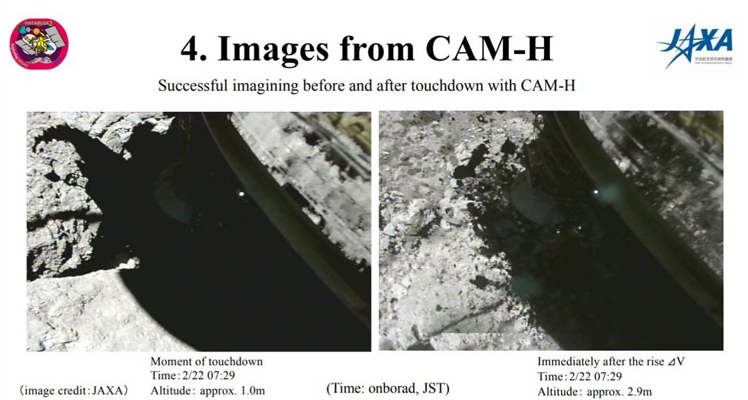 A Japan Aerospace Exploration Agency (JAXA) Hayabusa2 Project media briefing on March 5th reports that the first touchdown has been judged to have collected a “sufficient sample.”