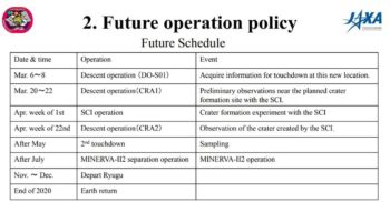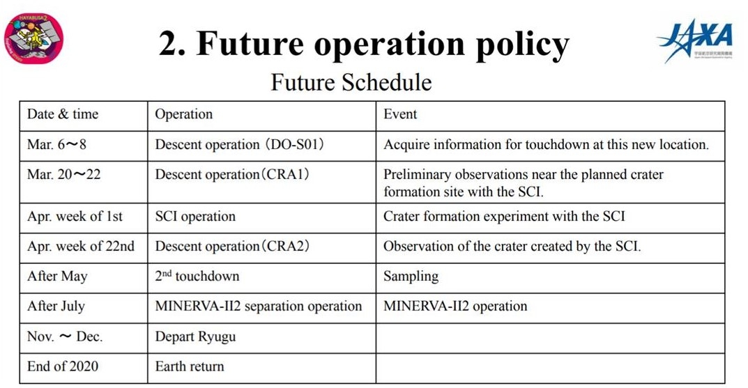 Japan’s Hayabusa2 made a successful first touchdown and sampling operation February 22, 2019 (JST) at asteroid Ryugu. Mission planners are moving forward with the next event – the experiment to form an artificial crater using the Small Carry-on Impactor (SCI).