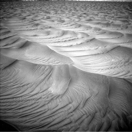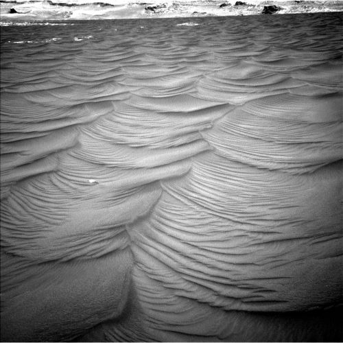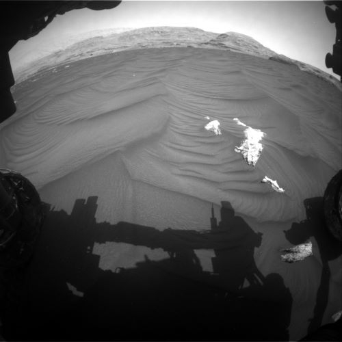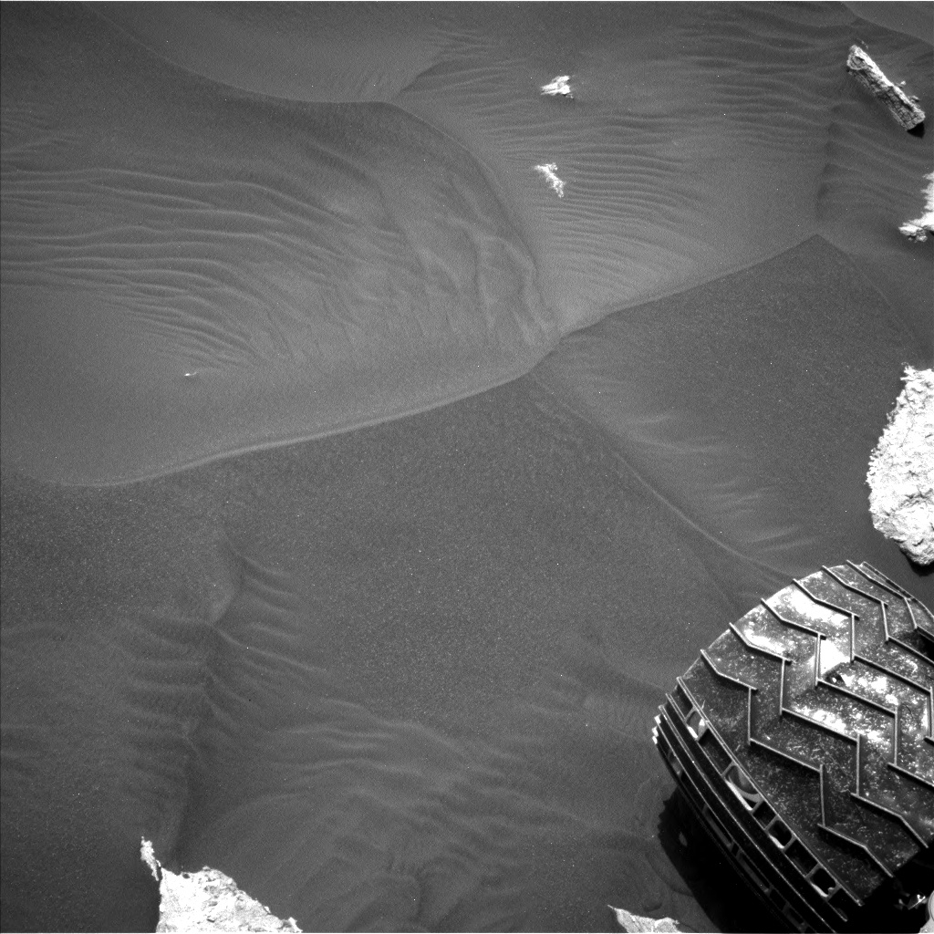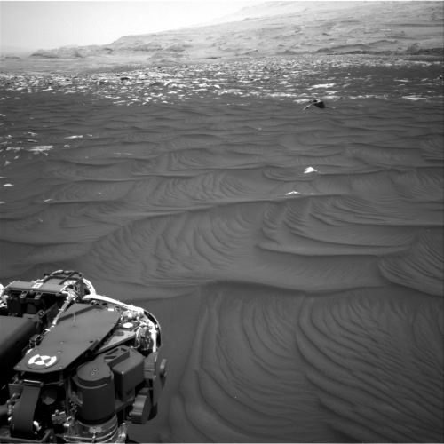 Curiosity rover approaching the “Sands of Forvie” sand sheet that looms just off in the distance of the image. Photo taken by Left Navigation Camera on Sol 2977, December 20, 2020