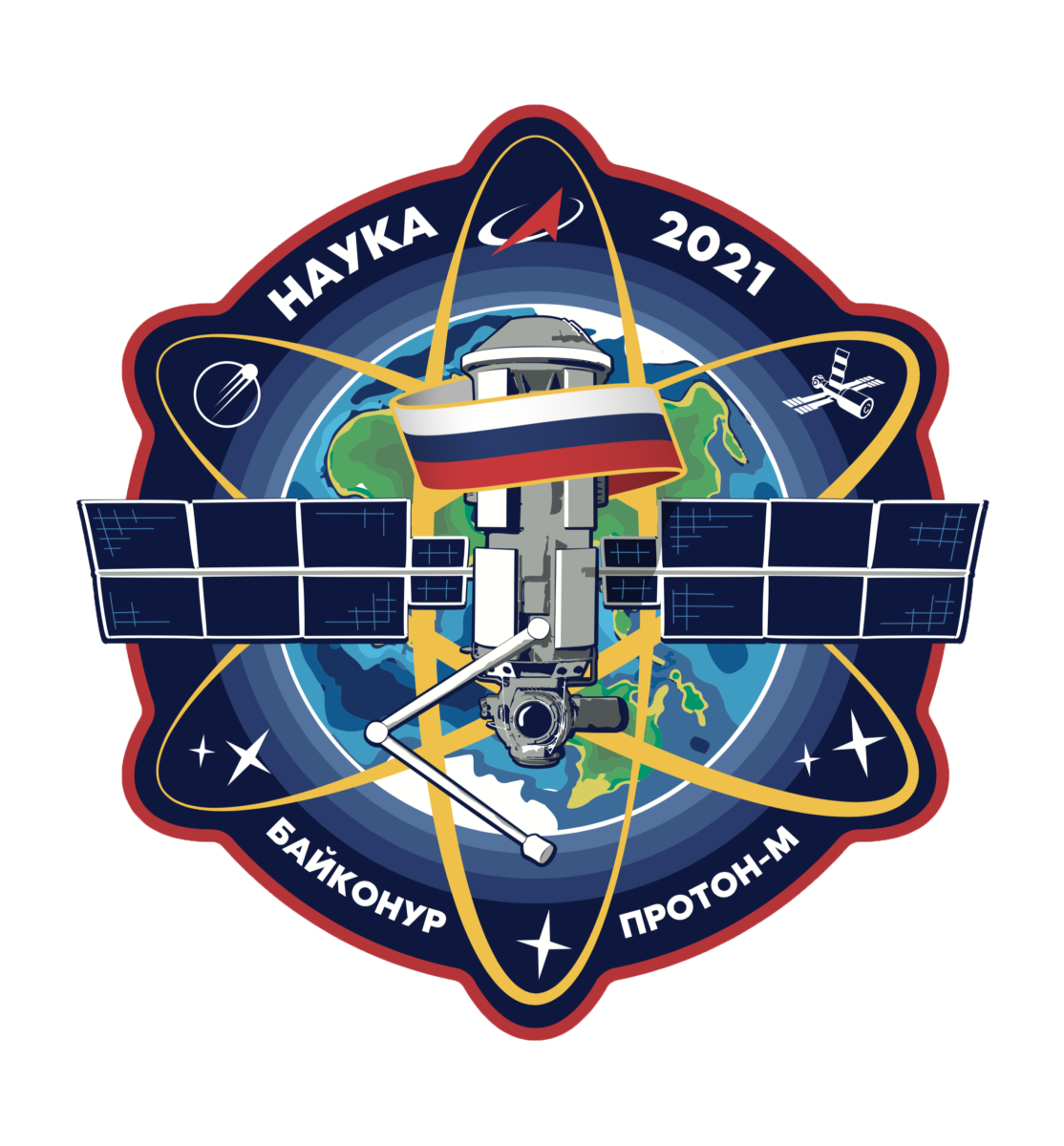Roscosmos has published a Nauka Multifunctional Laboratory Module logo. The module is depicted in its operational configuration: with the European Robotic Arm (ERA) manipulator deployed, open porthole, and an airlock. The Russian tricolor encircling the module is referring to its origin. The name of the module (НАУКА) “science” is placed along the circumference of the emblem together with the year of its launch, the launch site (БАЙКОНУР, the Baikonur Cosmodrome) and the Proton-M carrier rocket (ПРОТОН-М) to take it into near-Earth orbit.