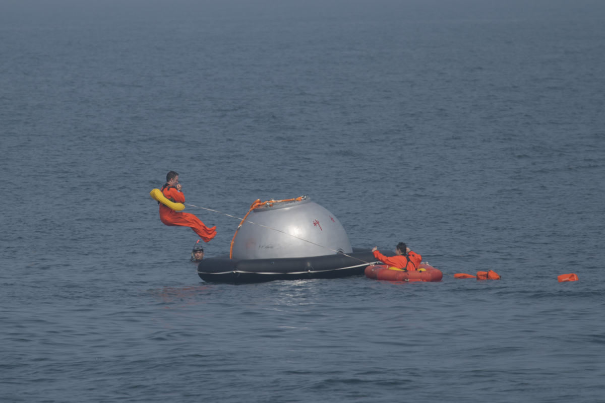 ESA astronaut Matthias Maurer jumping from a Chinese Shenzou capsule during sea survival training in August 2017. ESA astronauts Samantha Cristoforetti and Matthias joined Chinese colleagues in Yantai, China.