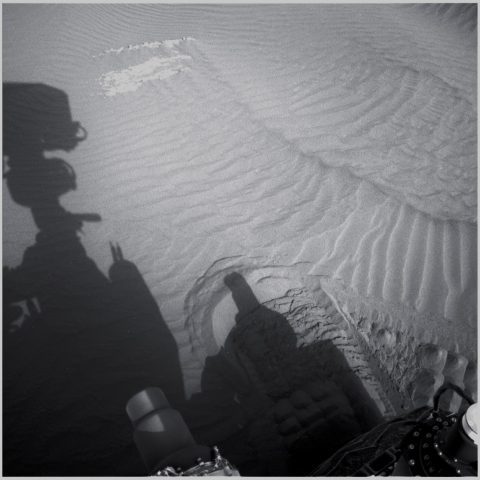 Self-portrait of NASA’s Curiosity Mars rover from January 19, 2016 shows the vehicle at “Namib Dune,” where the rover’s activities included scuffing into the dune with a wheel and scooping samples of sand for laboratory analysis.