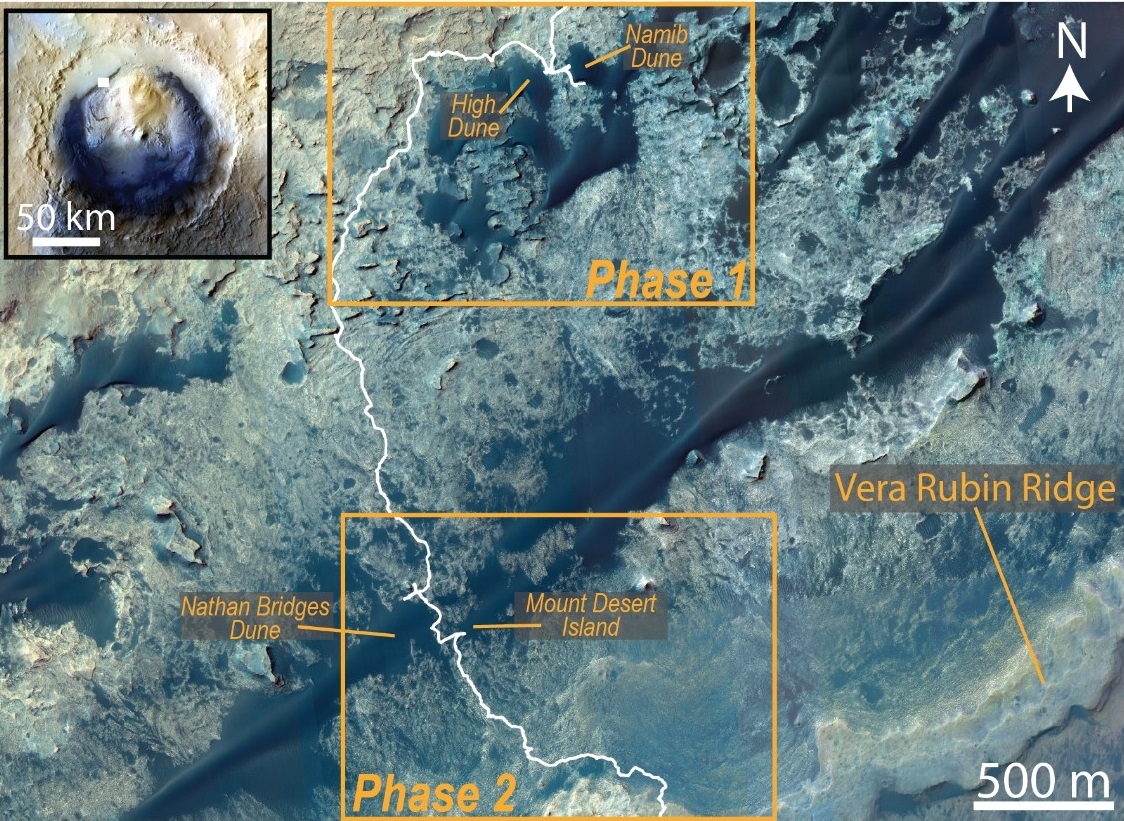 Curiosity’s traverse (white line) and two-phase investigation of the Bagnold Dunes. Inset shows the study location (white rectangle) within Gale crater.