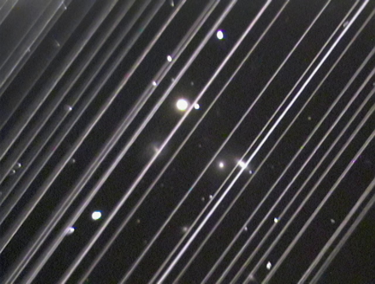An image of the NGC 5353/4 galaxy group made with a telescope at Lowell Observatory in Arizona, USA on the night of Saturday 25 May 2019. The diagonal lines running across the image are trails of reflected light left by more than 25 of the 60 recently launched Starlink satellites as they passed through the telescope’s field of view. Although this image serves as an illustration of the impact of reflections from satellite constellations, please note that the density of these satellites is significantly higher in the days after launch (as seen here) and also that the satellites will diminish in brightness as they reach their final orbital altitude.