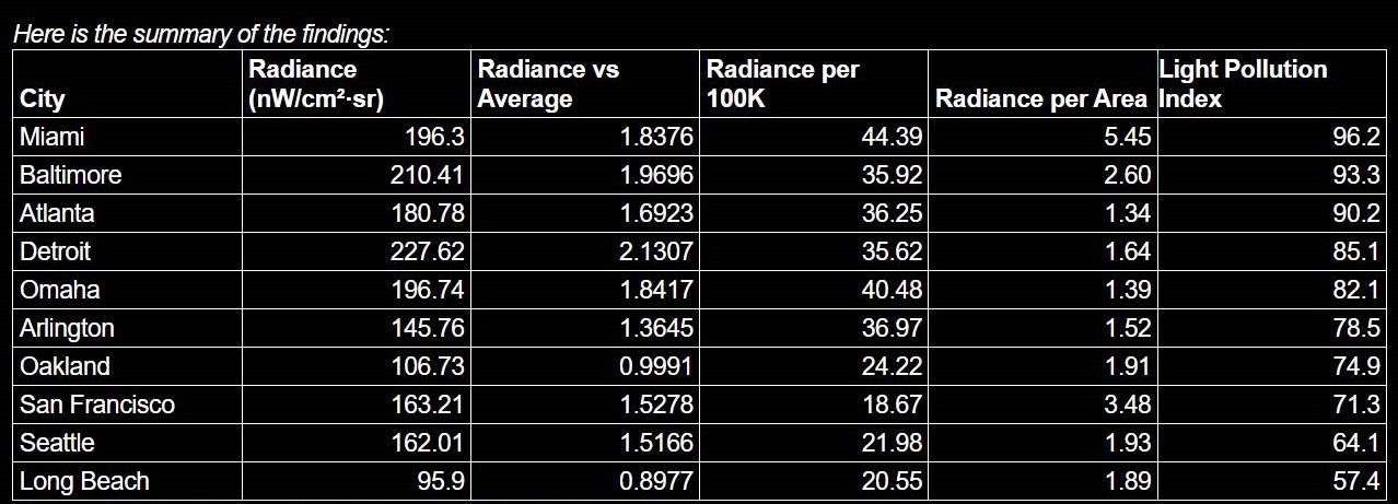 Light levels were calculated both per 100,000 residents and per area, using a light pollution map to ensure that cities could be fairly compared.