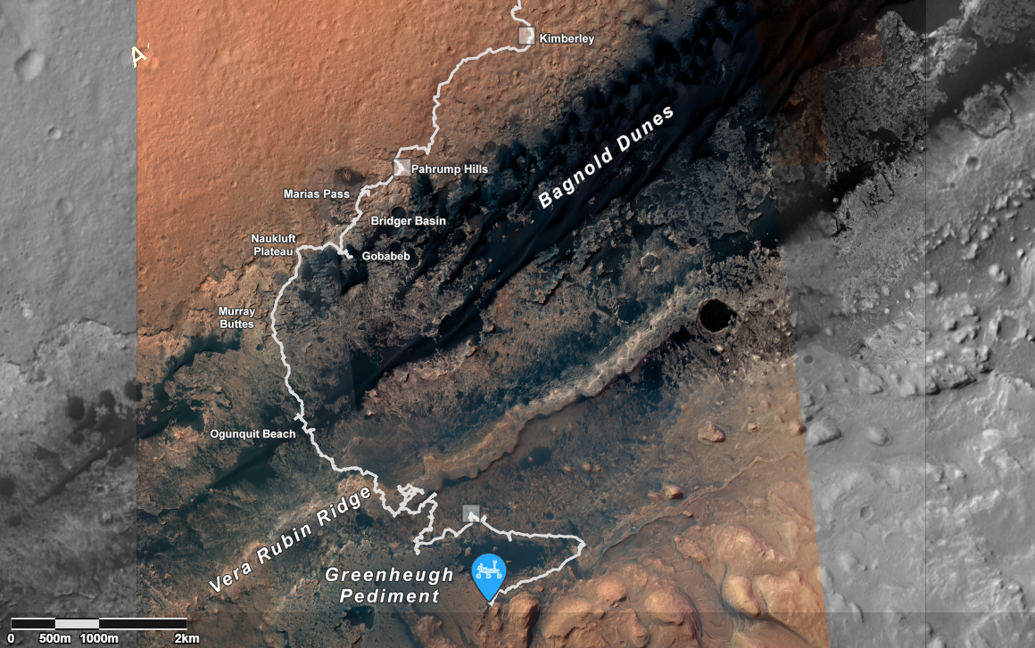 Curiosity’s location as of Sol 3312. Distance driven to date is 16.53 miles/26.61 kilometers.