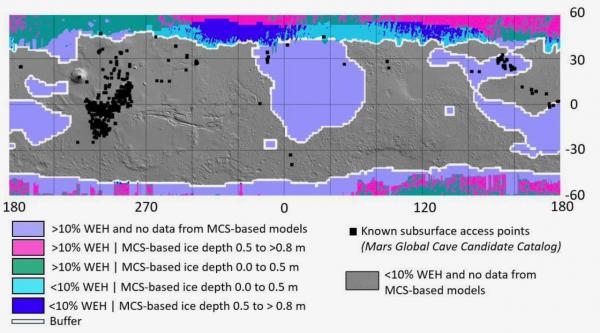 This map of Mars shows locations where ice is potentially located within 1 meter of the surface, based on neutron spectroscopy data (Mars Odyssey) or thermal infrared (IR) spectra (Mars Climate Sounder), and includes known subsurface access points from the Mars Candidate Cave Catalog. The gray regions are those lacking IR data and yielding water equivalent hydrogen (WEH) contents less than 10% from neutron spectroscopy. In the gray areas, closed-system ice or brine could potentially be present in the top 1 meter, but it is likely to be low in abundance and patchy in distribution. Gray regions may be appropriate for missions planning subsurface activities (as deep as 1 meter) with reduced bioburden requirements, if landing sites are a conservative buffer distance from subsurface access points.