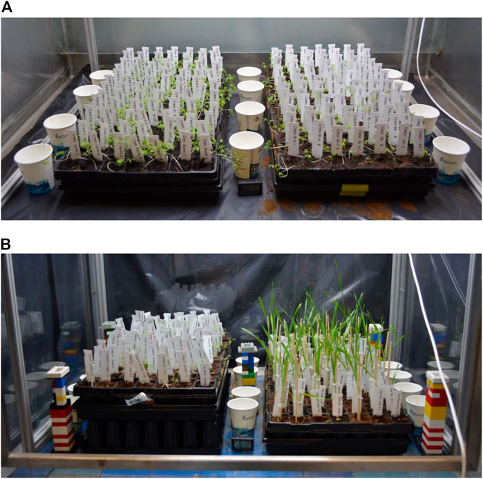 (A) sowing the cress control Earth (CE, left) and control Mars (CM, right). Shown are the pots with trays, the water cups and the temperature and humidity meter located in between the two trays. (B) is showing the radiation treatments in the radiation fume hood surrounded by lead walls. Treatments of cress (left) and rye (right) are indicated with white labels. Lego towers hold thermoluminescent dosimetry (TLD) cups at the top. Pictures were taken on the morning of harvest.