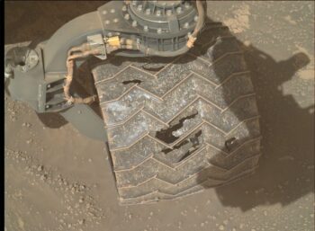 Curiosity operators have recently done full Mars Hand Lens Imager (MAHLI) wheel imaging. Image shows wheel, bedrock and some nodules.