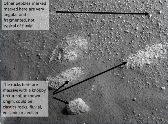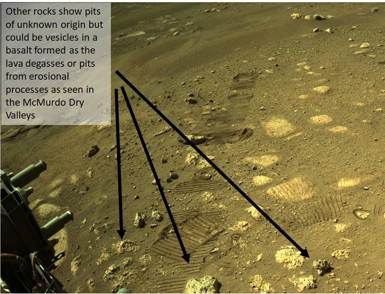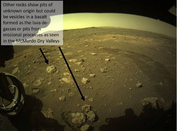 “But the vesicles could be volcanic from degassing of volatiles from a flow,” Mustard says. They could be pits formed from eolian abrasion “or through other weather processes such as seen in pits we see on Ferrar Dolerite rocks in the McMurdo Dry Valleys.”