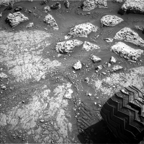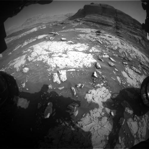 Curiosity rover’s right middle and rear wheels had turned up on some of the lumpier rocks that dot the current terrain (one of which you can just spy under the right middle wheel in the above image)(one of which you can just spy under the right middle wheel in this image taken by Left Navigation Camera taken on Sol 3047.