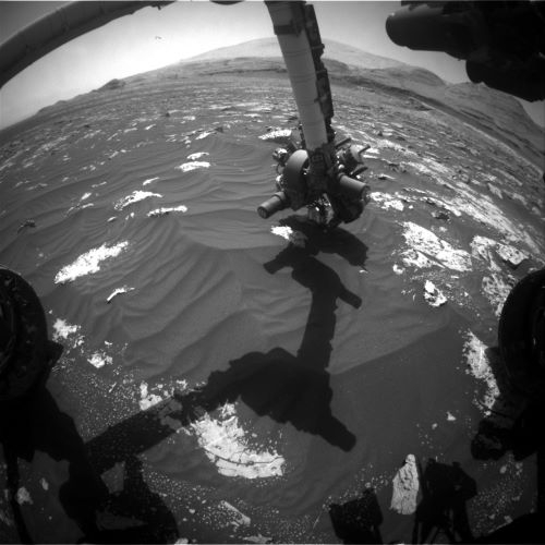 Ken Herkenhoff, a planetary geologist at the USGS Astrogeology Science Center in Flagstaff, Arizona, reports that a recent drive by the robot on Sol 3044 brought it to “an area mostly covered by dark sand, with very few exposed rocks in the arm workspace.”