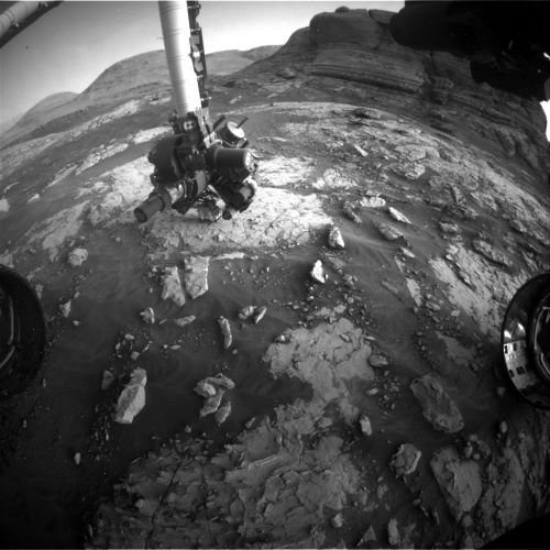 A flat patch of bright outcrop on Mars, a rover drill site imaged by Curiosity’s Left Navigation Camera on Sol 3049.