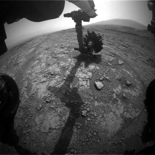 The robot’s Alpha Particle X-Ray Spectrometer (APXS) and Mars Hand Lens Imager (MAHLI) are investigating a target “Champagnac,” which is a large piece of rock in the multitude of options in the rover’s workspace, which had made itself interesting by its darker color, which could indicate a change in chemistry from the usual-colored rocks scientists have been investigating lately.