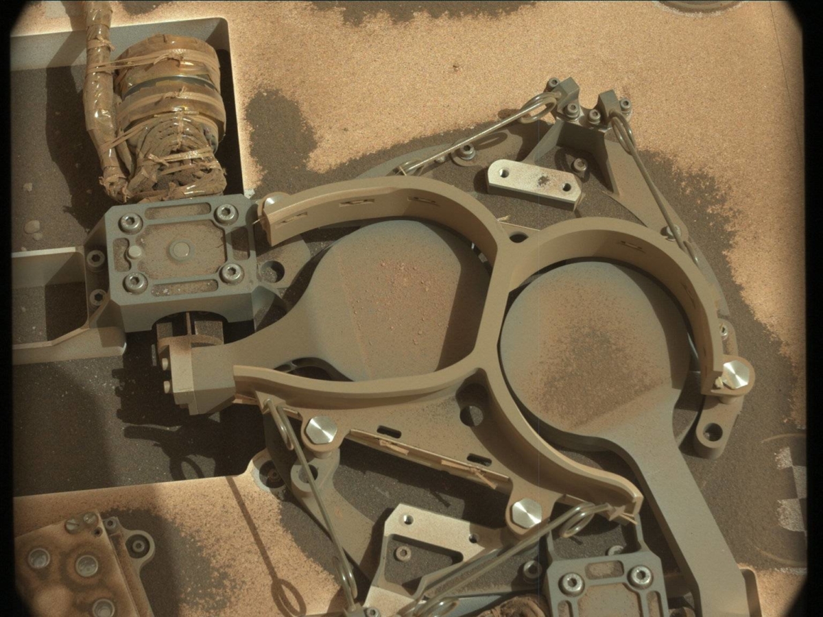 During the delivery process, Curiosity opened one of the SAM inlet covers and the rover arm was set to deposit a portion of the fine rock powder from the drill bit.