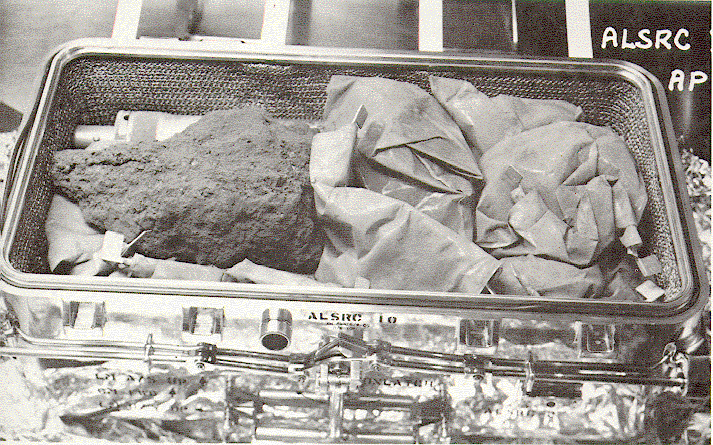 One of the Apollo 16 sample boxes being opened in the Lunar Receiving Laboratory on Earth. The box contains a large rock and many small sample bags.