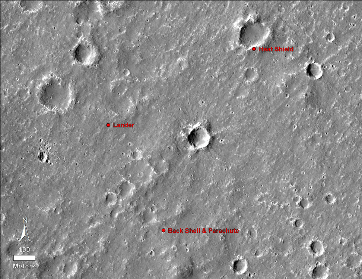 An annotated image of the surface of Mars, taken by the HiRISE camera on NASA’s Mars Reconnaissance Orbiter (MRO) on May 30, 2014. The annotations — added after InSight landed on Nov. 26, 2018 — display the locations of NASA’s InSight lander, its heat shield and parachute.