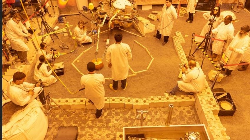 ForeSight, a fully functional, full-size model of NASA’s InSight lander, sits in a lab space that has been sculpted to match terrain in front of the real lander on Mars.