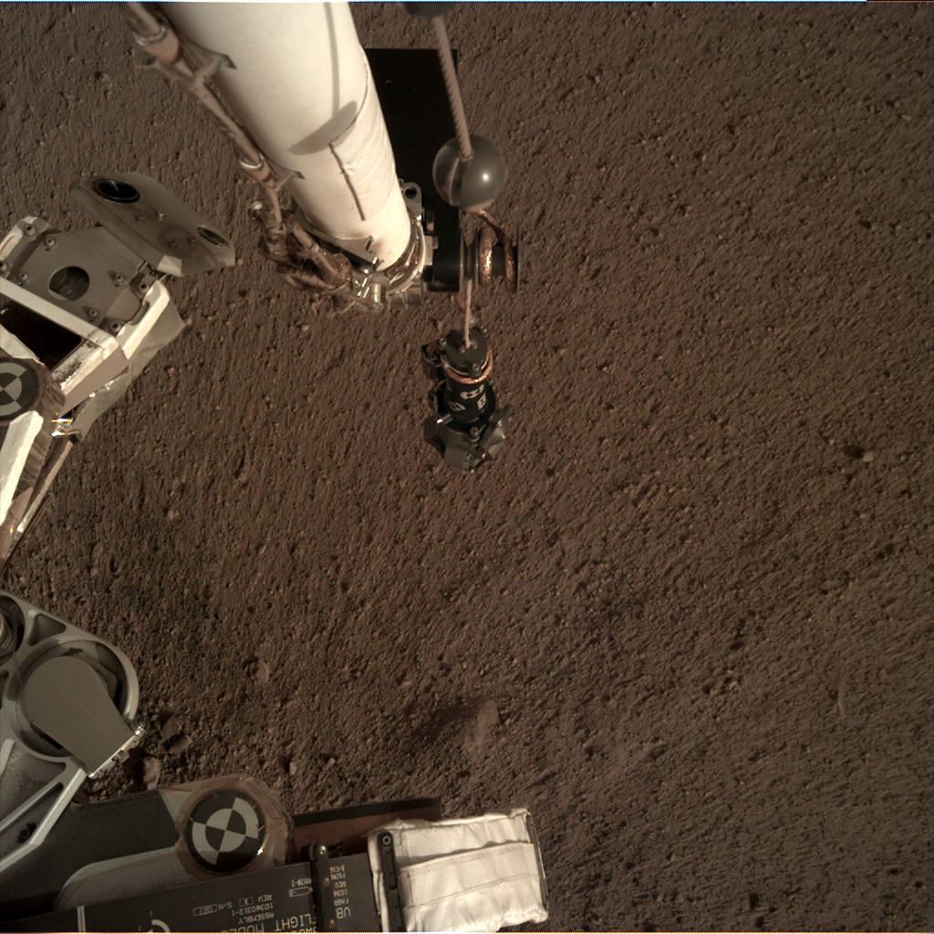 By Late January, assuming that no problems crop up, the InSight team plans to deploy the German-provided Heat Flow and Physical Properties Probe, or HP3) onto the Martian surface. HP3 will be on the east side of the lander’s work space, roughly the same distance away from the lander as the seismometer.
